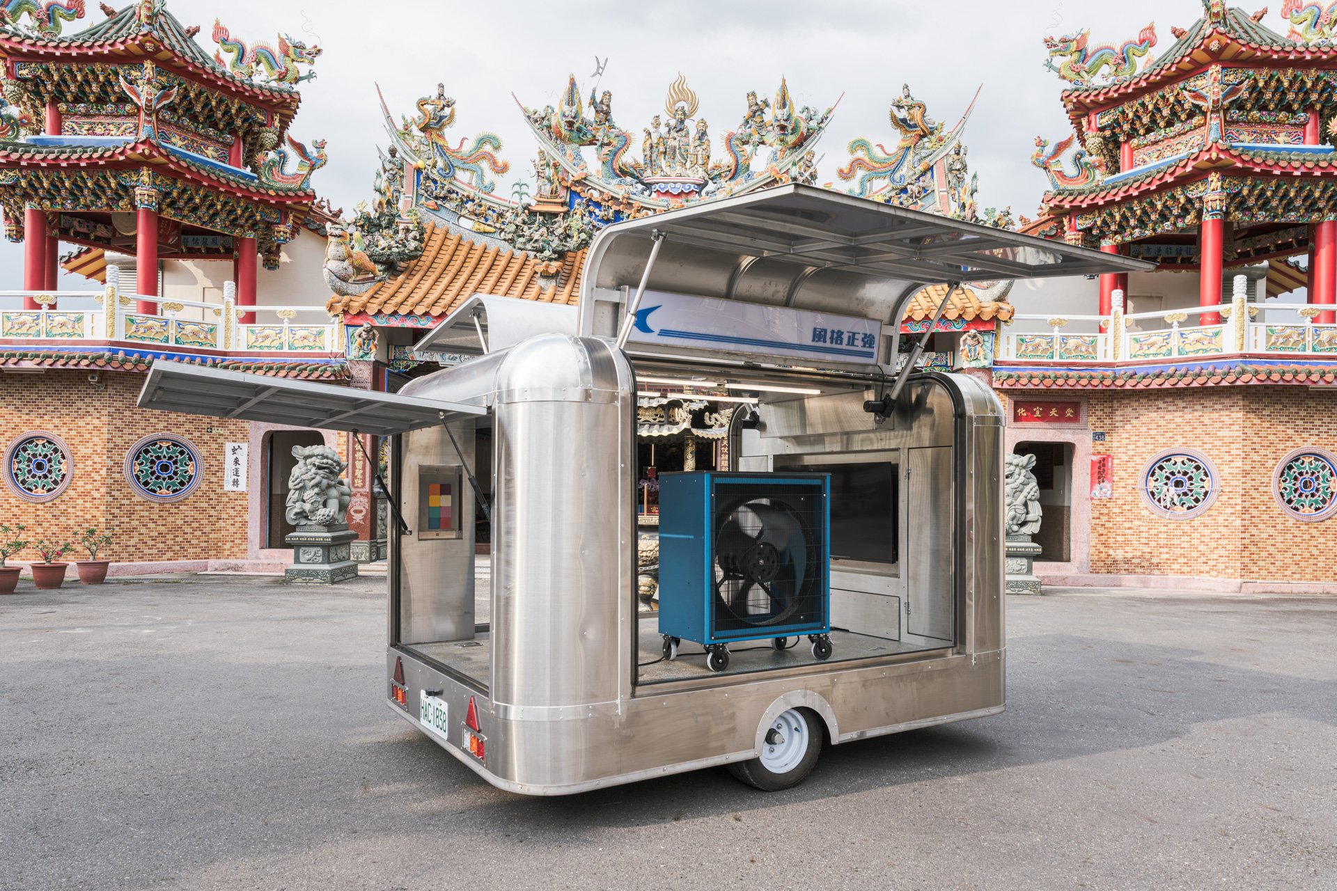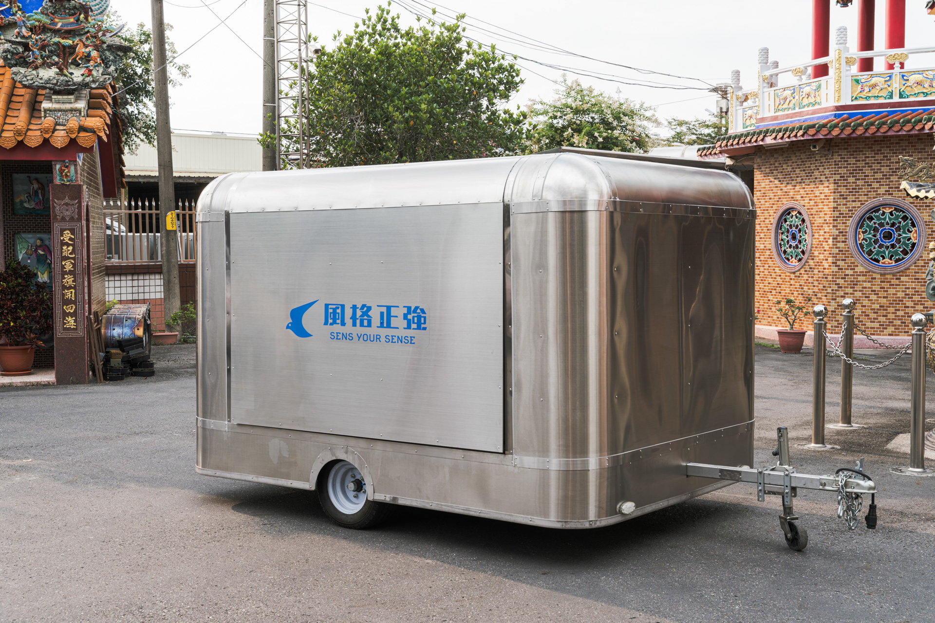 展示車以上掀式的 「 鷗翼設計 」呼應品牌的代表物 「 海鷗 」,這台展示車以拖車的使用方式設計規劃,外觀整體以不銹鋼板製作,委託了一樣位於彰化的專業拖車工廠來進行打造,如同老闆所說,彰化強大的加工產業,一直是正強最強而有力的後盾。